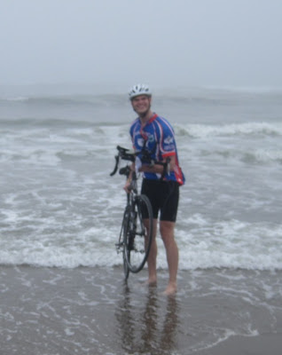 Well, folks, it's official -- day one of my cross country challenge is in the books. And what a day it was. After leaving our hotel in San Francisco, we encountered some rain and heavy fog after about 8 miles. This lasted for about 20 miles, so we had to brave the cold as we did our ceremonial rear wheel dip in the Pacific Ocean (see picture above). Furthermore, the fog hampered our ability to see the Golden Gate Bridge as we pedaled across. That said, it was still exciting to make the 1.7 mile trek over this famous landmark.Strangely enough, as soon as we crossed the Bridge the sun began to shine brightly, and it remained sunny for the rest of the ride. We had a "SAG stop" (a required stop where all the riders sign in and have an opportunity to fill up water bottles and have a snack), and made our way through Sausalito -- an absoultely gorgeous town.